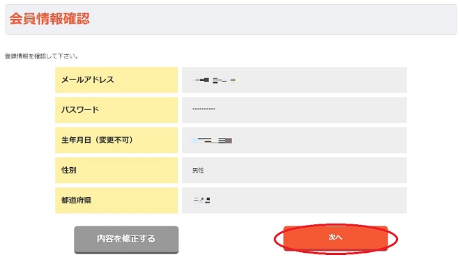最後に会員情報確認がありますので、再度間違いが無いことを確認後「次へ」をクリックしてください。