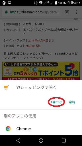すると【Android】の場合は、画面下部に「Y!ショッピングで開く 1回のみ 常時」と表示されますので、私はいつも1回のみをクリックしているので「1回のみ」をクリックしましょう。