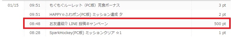 LINEに投稿した翌日に500ポイント(50円相当)がすぐにプレゼントされました。