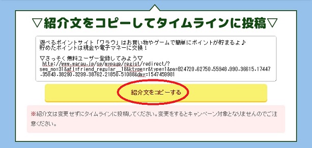 【warau(ワラウ)スマホ】に掲載の指定の友達紹介文をコピーして、LINEのタイムラインに貼り付けて「全体公開」にしてURLをコピーして【warau(ワラウ)スマホ】サイトで報告することで500ポイント(50円相当)プレゼント。