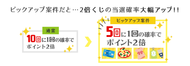 現在好評の10回に1回の確率でポイント2倍【2倍くじ】ですが、i2iポイントがピックアップした案件を利用すると、通常10回に1回の確率でポイントが2倍になるところ、5回に1回の確率でポイントが2倍になります!!