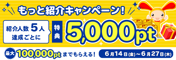 しかし、キャンペーン期間中の6月14日~27日の期間中は、お友達を5人紹介するごとに5,000ポイント(500円相当)が特典としてプレゼントされます。