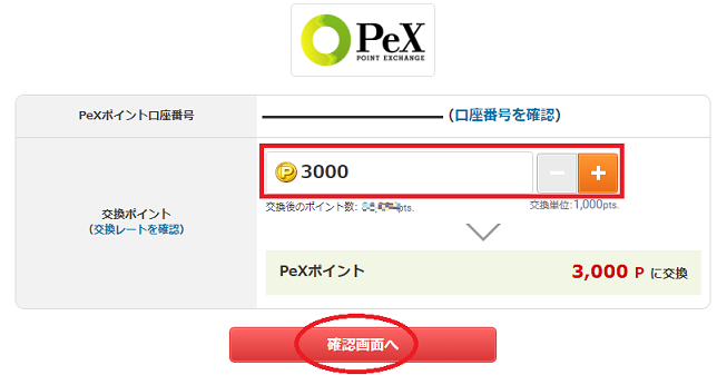 交換するポイント数を決めます。ECナビからPexへのポイント交換は3,000ポイント(300円相当)から行う事ができます。右側の-+をクリックして交換ポイント数を決めて「確認画面へ」をクリックしましょう。