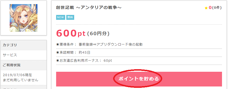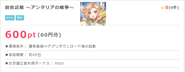 ところが簡単にポイントが稼げるアプリ広告も存在しています。この記事で紹介する【創世記戦 ~アンタリアの戦争~】は事前予約することで、ダウンロード&起動だけで通常では考えれない高ポイント(600ポイント)がもらえます。但し、ポイントが承認されるまで時間はかかりますが。それでも、お手軽なのでスマホを持っている方は利用してお金を稼ぎましょう(事前予約はパソコンからでも可能です)。