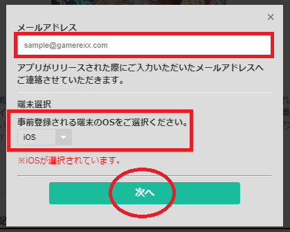 登録するメールアドレスとアプリをダウンロードする末端のOSを選択して「次へ」をクリック(タップ)しましょう。