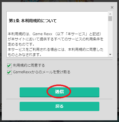 利用規約に軽く目を通し、「利用規約に同意する」「GameRexxからのメールを受け取る」にチェックを入れて「送信」をクリック(タップ)しましょう。