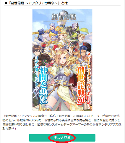 「ポイントを貯める」をタップすると、「創世記戦 ~アンタリアの戦争~」の事前登録ページに移動するので移動したページの「もっと見る」をクリック(タップ)しましょう。