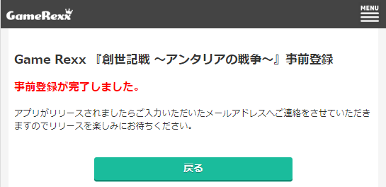 以上で創世記戦 ~アンタリアの戦争~の事前登録は完了です。後は登録したメールアドレスにGameRexxからメールが配信されるので配信されたメールに記載のURLからアプリをダウンロード&起動で600ポイント(60円相当)を獲得することができます。