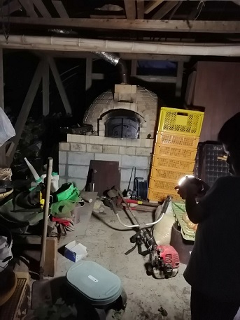さらに、石窯がある小屋を照らしてみます。上の画像はランタン点灯前です。真っ暗で何も見えません。