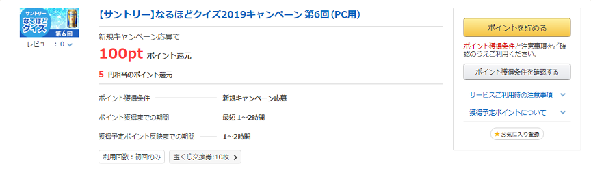 ポイントインカムに掲載されている「サントリーなるほどクイズ2019第6回」の広告の「ポイントを貯める」をクリックしてから「サントリーなるほどクイズ2019第6回」に回答&応募することで現金やAmazonギフト券に交換できるポイントが100ポイント(5円相当)貯まります。