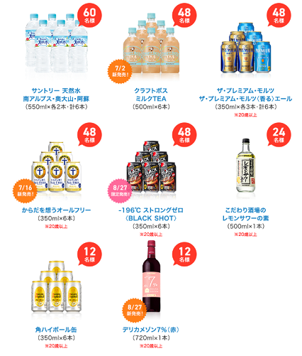 ※応募の際に欲しい賞品を選択しますが、お酒の賞品は20歳以上の方のみ選択できるので20歳未満の方はサントリー 天然水 南アルプス・奥大山・阿蘇(550ml×各2本・計6本)かクラフトボス ミルクTEA(500ml×6本)のみの選択となります。