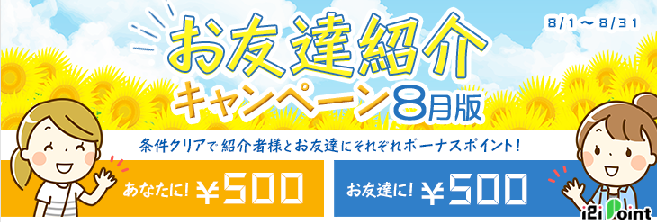 お友達紹介バナー経由で新規に登録し期間中(9月30日まで)に50,000ポイント(5,000円相当)以上のポイントを貯め、貯まったポイントを交換することでお友達、紹介者それぞれに通常の友達紹介ボーナス1,000ポイント(100円相当)に加え、5,000ポイント(500円相当)のボーナスをプレゼント!