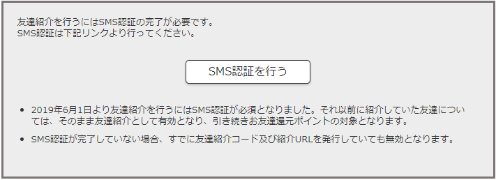 - SMS認証が完了していない場合、すでに友達紹介コード及び紹介URLを発行していても無効となります。
