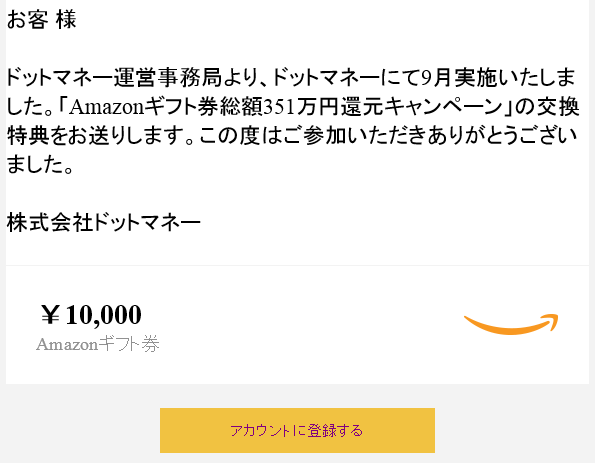 10月26日にドットマネーから「Amazonギフト券総額100万円分還元キャンペーン」の増額分のAmazonギフト券が送信されてきました。