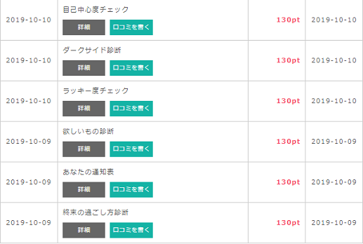 診断系アプリなど、130ポイントもらえるアプリ広告は250件の設問に回答する必要がありますが、広告収入が目当てのアプリですので、回答は適当でかまいません。その代わり広告が数多く表示されるのでわずらわしいですけど、我慢できるレベルです。