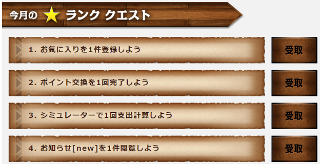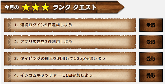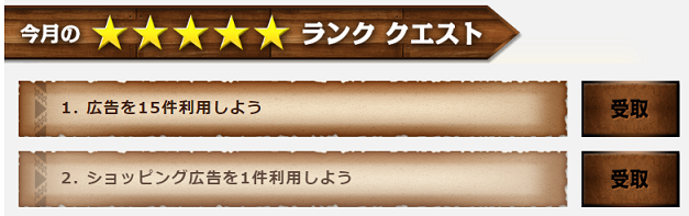 私が過去に全クリアした際に出現した最上級クエストは「月間累計300,000ポイント(3万円相当)稼ごう」と、ポイントサイト歴が長い私には不可能なクエストでした。もしかすると初心者さんならクレジットカード発行や資料請求、100%ポイント還元商品購入などでクリアを狙える可能性もありますが、リスクを考えると500円の為に無理にクリアを狙う必要はないかもしれませんね。