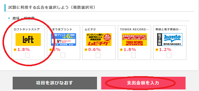 「試算に利用する広告を選択しよう」から「LOFT」にチェックを入れて「支出金額を入力」をクリックしましょう。
