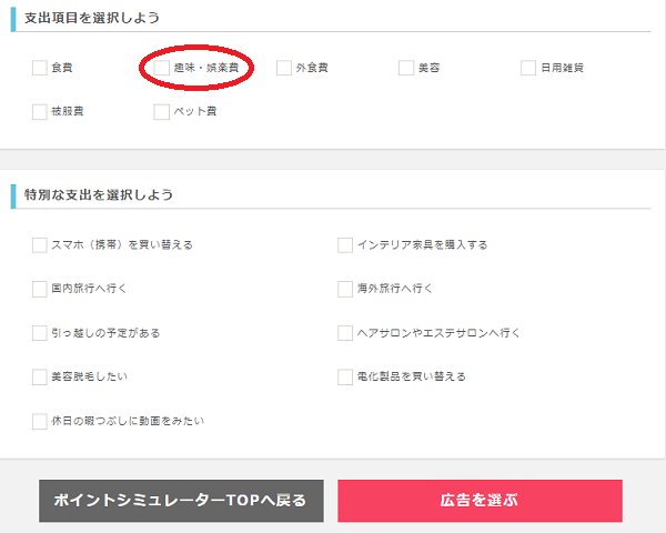 「支出項目を選択しよう」から「趣味・娯楽費」にチェックを入れて、「広告を選ぶ」をクリックしましょう。