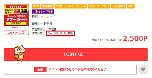 人気のヤフーカードであれば、ポイント確定までに要する期間が14日前後ですので、十分間に合うと思います。他の広告で2,500ポイントを貯めれば条件クリアとなりますが、ヤフーカードの発行でもらえるポイントとしては少し少ないのであまりおすすめはできません。
