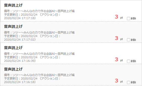 「音声チェック編」は3件チェックすると1ポイント(0.5円相当)ともらえるポイントが少ないので、「音声読上げ編」をメインに、時間があまった場合は「音声チェック編」も加えて沢山稼せぎましょう。