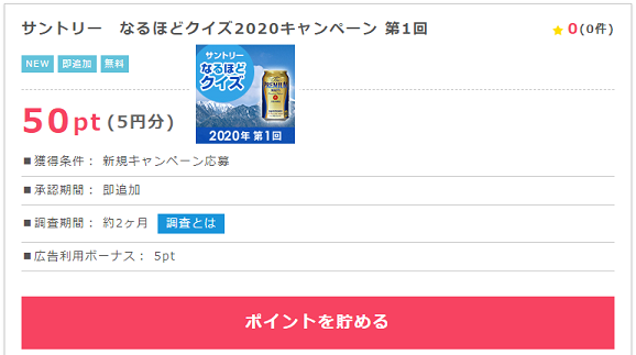 ポイントインカムに掲載されている「サントリーなるほどクイズ2020第1回」の広告の「ポイントを貯める」をクリックしてから「サントリーなるほどクイズ2020第1回」に回答&応募することで現金やAmazonギフト券に交換できるポイントが50ポイント(5円相当)貯まります。