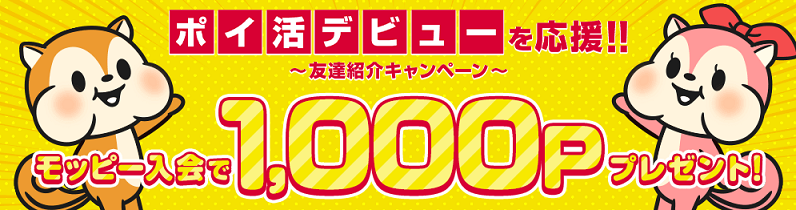 初めてモッピーに登録し、条件をクリアすることで1,000ポイント(1,000円相当)のポイントがプレゼントされるキャンペーンとなっています。まだモッピーへ登録されていない方はキャンペーンに参加されてみてはいかがでしょうか?
