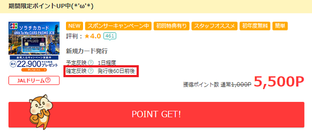 おすすめ広告の「ソラチカカード」を利用すると一気に5500ポイント貯まり、条件をクリアできますが、ポイント確定までに要する期間が60日と7月31日までにポイントが確定しないのでボーナス2,000ポイント(2,000円相当)がもらえなくなってしまいます。