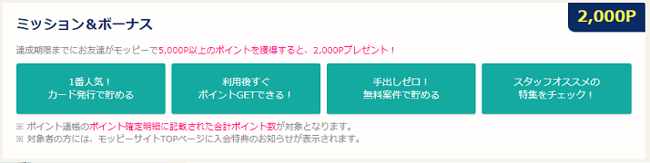 初めてモッピーに登録し、条件をクリアすることで2,000ポイント(2,000円相当)のポイントがプレゼントされるキャンペーンとなっています。