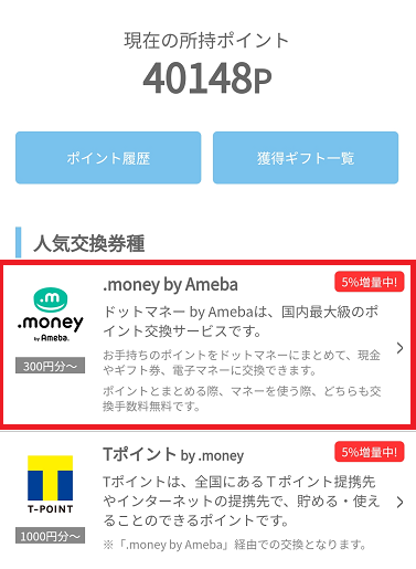 そして5月中にドットマネー(Tポイントも)へポイント交換すると5%増量キャンペーンが開催されているので、ドットマネーへ交換することにしました。