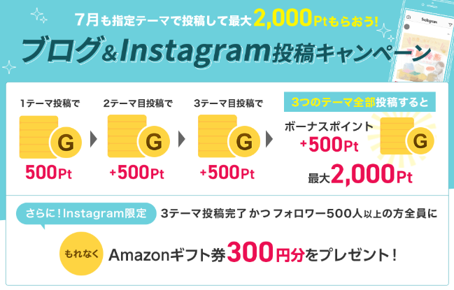 ポイントサイト【GetMoney!】ではブログやInstagramへテーマに沿った内容の投稿をすることで最大で2,000ポイント(200円相当)もらえるキャンペーンが開催されています。さらに、インスタへの投稿に限りフォロワー数が500人以上の人には、もれなくAmazonギフト券300円プレゼントされます。
