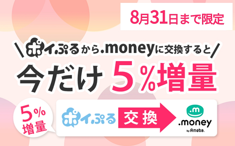 ポイぷるで貯めたポイントは、ポイント合算サイト【ドットマネー】に交換することで、5%増量されます。8月31日までとなっていますが、毎月開催されているので9月以降も継続される可能性は高いキャンペーンとなっています。