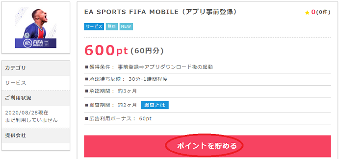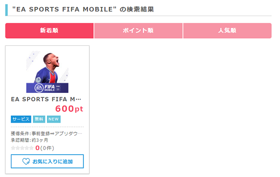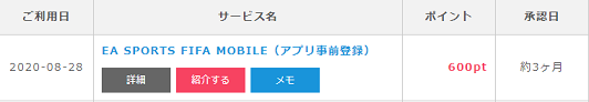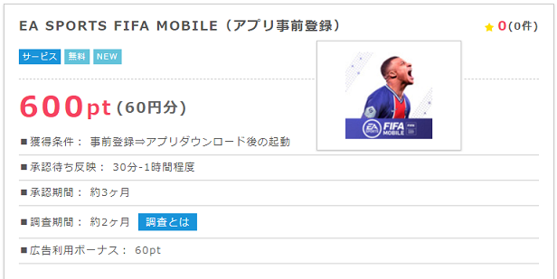 ところが簡単にポイントが稼げるアプリ広告も存在しています。この記事で紹介する【EA SPORTS FIFA MOBILE】は事前予約することで、ダウンロード&起動だけで通常では考えれない高ポイント(600ポイント)がもらえます。但し、ポイントが承認されるまで時間はかかります。それでも、お手軽なのでスマホを持っている方は利用してお金を稼ぎましょう(事前予約はパソコンからでも可能です)。