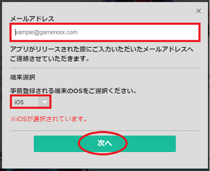 登録するメールアドレスとアプリをダウンロードする末端のOSを選択して「次へ」をクリック(タップ)しましょう。