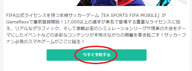 「ポイントを貯める」をタップすると、「EA SPORTS FIFA MOBILE」の事前登録ページに移動するので移動したページの「今すぐ予約する」をクリック(タップ)しましょう。