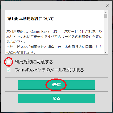 利用規約に軽く目を通し、「利用規約に同意する」「GameRexxからのメールを受け取る」にチェック入れて「送信」をクリック(タップ)しましょう。