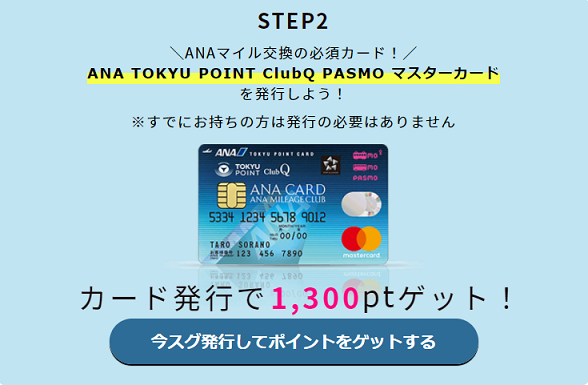 ANAマイルへの交換は、「ANA TOKYU POINT ClubQ PASMO マスターカード」が必須となっています。既に保有している人は次のステップへ、まだ保有していない人は、ハピタス経由で発行すると1,300ポイント(1,300円相当)もらえるので、発行してからキャンペーンに参加しましょう。