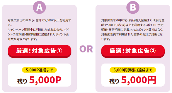 対象広告②の中から、商品購入金額または旅行金額で5,000円(税抜)以上を利用する。ポイント予定明細・獲得明細に記載されたポイント数ではなく、対象広告内で利用された金額の合計が対象となります。