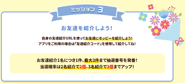 私は、それほど多くのお友達をモッピーで獲得していませんが、今回のキャンペーンは沢山のお友達を紹介した方が当選確率が上がる訳ではありません。最大で3名なので、1人でも紹介できたらチャンスがあります。