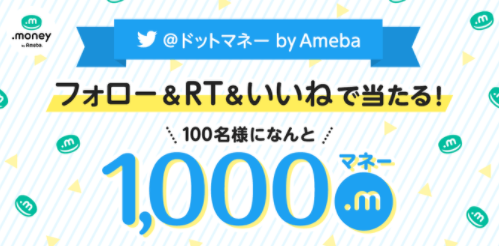 ドットマネー公式Twitterアカウントをフォローし、キャンペーン対象のツイートをリツイートした方の中から抽選で100名様に1,000マネー(1,000円相当)をプレゼント。