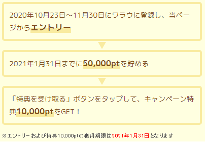 キャンペーン期間中にワラウに登録し、キャンペーンページからエントリー後、2021年1月31日までに、ワラウポイント50,000ポイント(5,000円相当)を貯めると、1,000円分のポイントがプレゼントされます!