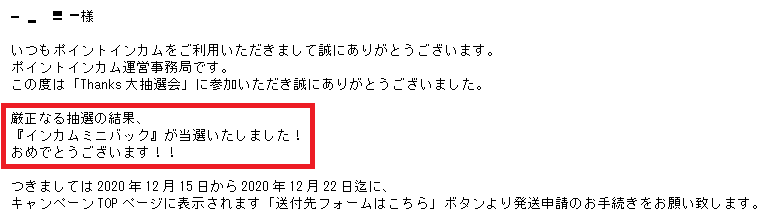 1通目から少し置いて、2通目の「当選のお知らせ」が届きました。