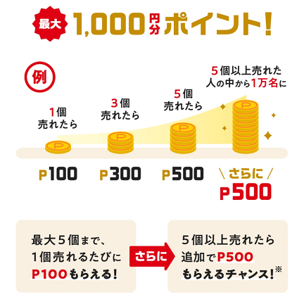 - 5個以上売れたら抽選で1万名様に500円分のポイントがアタリます。