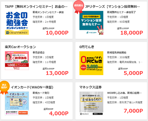 他にも多くのおすすめ広告の掲載がありますが、入会の翌々月末までにポイントが確定している必要があるので、確定反映にかかる日数を確認して広告を利用しましょう。