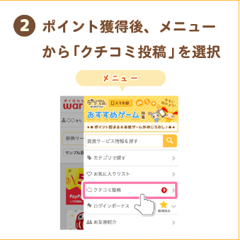 ②ポイントが承認されたら、右上のメニューから「クチコミ投稿」をタップしよう。