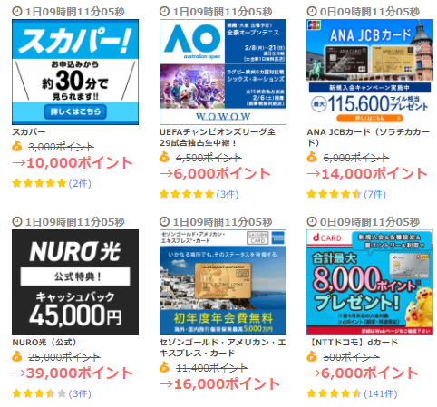 トップページには還元額が大幅にアップしているタイムセール広告が掲載されているので、それらを利用しても良いでしょう。クレカの発行などが条件となりますが、貰える報酬は期待できます。