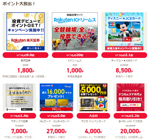 ポイント大放出に掲載されている広告はどれも業界トップクラスですので、2,000ポイントもらえる事を考えるとどれもダントツで高くなっていますので、お好きな広告を利用しましょう。