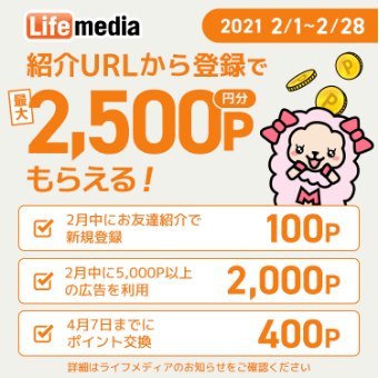 キャンペーン期間中、お友達紹介でライフメディアに新規登録した方に、最大2,500円分ポイントプレゼント!します。