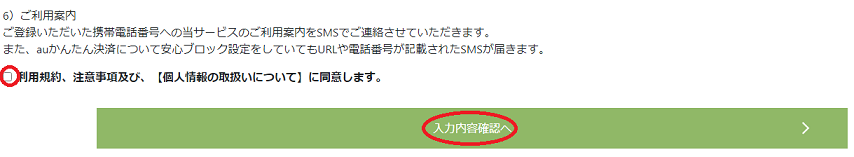 利用規約が書かれているので、サッと目を通して問題がなければ「利用規約、注意事項及び、【個人情報の取扱いについて】に同意します」にチェックを入れて、「入力内容確認へ」をクリックします。