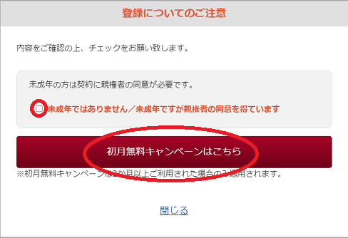 「未成年ではありません/未成年ですが親権者の同意を得ています」にチェックを入れて「初月無料キャンペーンはこちら」をクリックします。