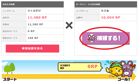 「捕獲」をクリックすると、200円~500円相当のポイントが必ずもらえます。